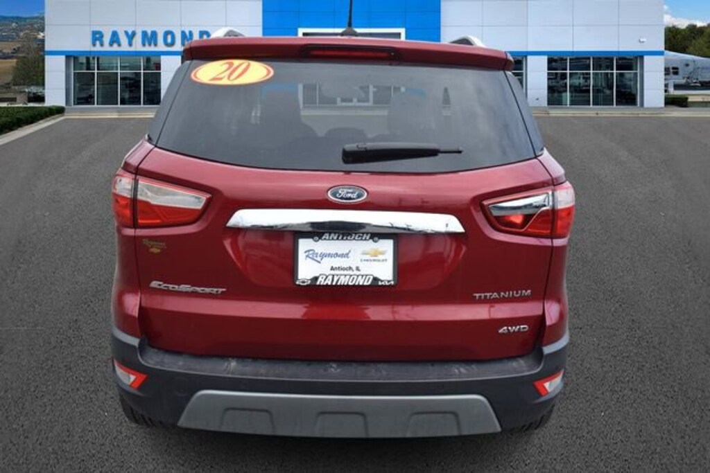 Ruby Red 2020 Ford EcoSport Titanium 4WD Near Antioch, Kenosha, Gurnee, McHenry, Round Lake & Fox LakeSearching for a 2020 Ford EcoSport Titanium near Antioch or Kenosha? This CARFAX One-Owner, Clean CARFAX 2020 Ford EcoSport Titanium 4WD in Ruby Red is a compact SUV packed with premium features, great fuel economy, and confident 4WD capability. Conveniently located near Gurnee, McHenry, Round Lake, and Fox Lake, this EcoSport is an excellent choice for daily commuting and year-round driving.Powered by a 2.0L I4 Ti-VCT GDI engine paired with a 6-Speed Automatic transmission, this EcoSport delivers an efficient ride with an EPA-estimated 23 MPG city / 29 MPG highway.Performance & Efficiency2.0L I4 Ti-VCT GDI Engine6-Speed Automatic Transmission4WD23 City / 29 Highway MPGLow Miles / Great ValueOdometer is 25,157 miles below market average!Recent ArrivalKey Features & OptionsTechnology & InfotainmentSYNC 3 Communications & Entertainment SystemNavigation SystemSiriusXM RadioSiriusXM Traffic & Travel LinkRadio: AM/FM Stereo w/MP3 CapableSteering Wheel Mounted Audio ControlsComfort & ConveniencePower MoonroofRemote Keyless EntryEquipment Group 400AIf youre looking for a Ford EcoSport Titanium 4WD near Antioch, Kenosha, Gurnee, McHenry, Round Lake, or Fox Lake, this Ruby Red 2020 model delivers premium features, low miles, and strong efficiency in a compact SUV.Contact us today to schedule your test drive availability is limited!