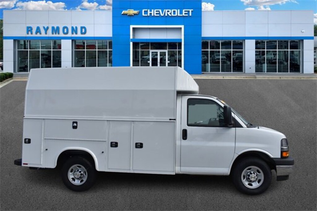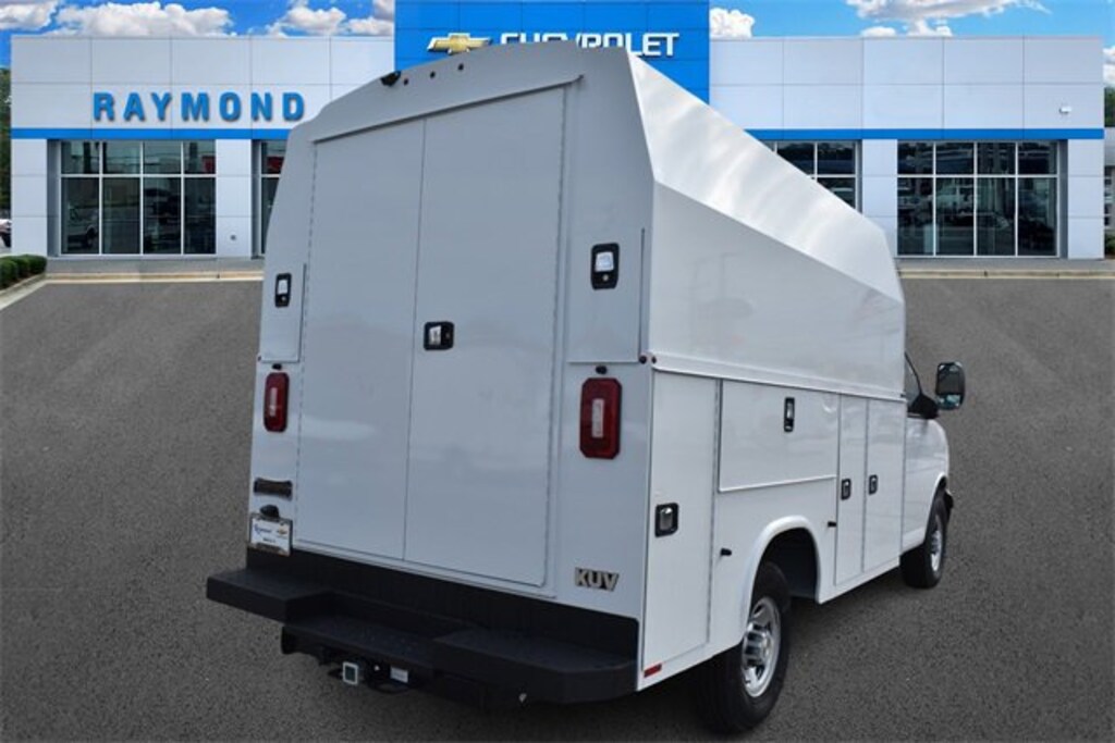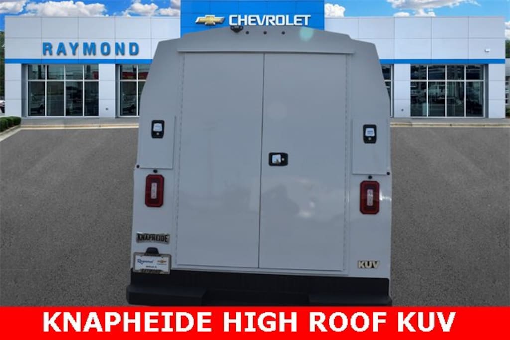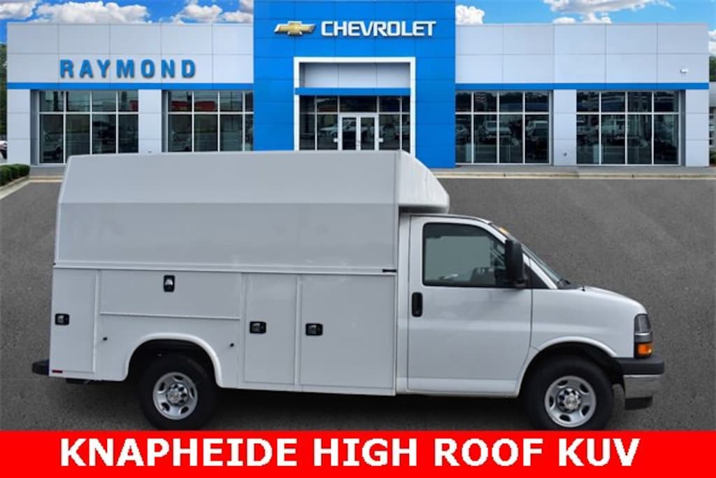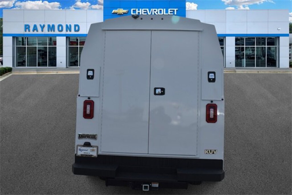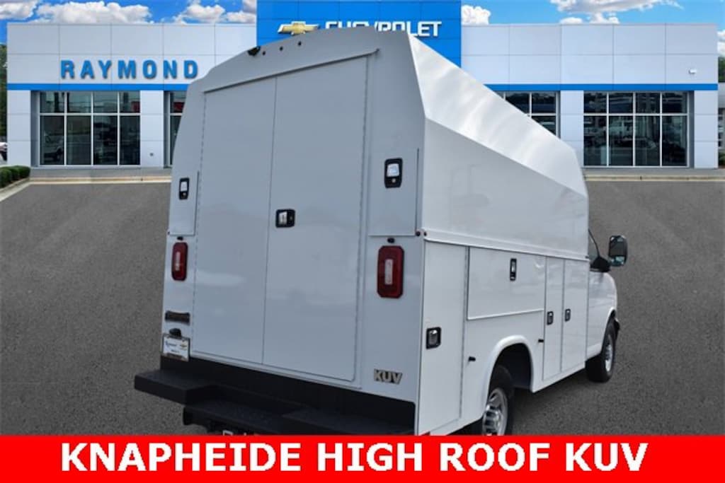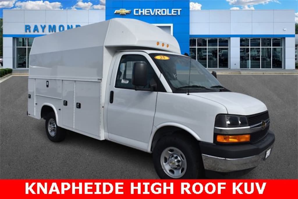 **COMMERCIAL VEHICLE** **KNAPHEIDE HIGH ROOF KUV** **80 CAB TO AXLE 129 BODY LENGTH 75.8 INTERIOR BODY HEIGHT** **KNAPLOCK KEYLESS ENTRY SYSTEM** **BACKUP ALARM** **RECEIVER HITCH-CLASS V** **ELECTRIC BRAKE CONTROL** **REDUCER SLEEVE- CLASS V** 2025 Chevrolet Express 3500 Work Van Cutaway RWD