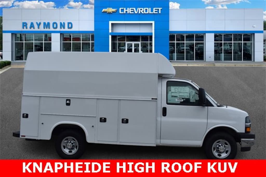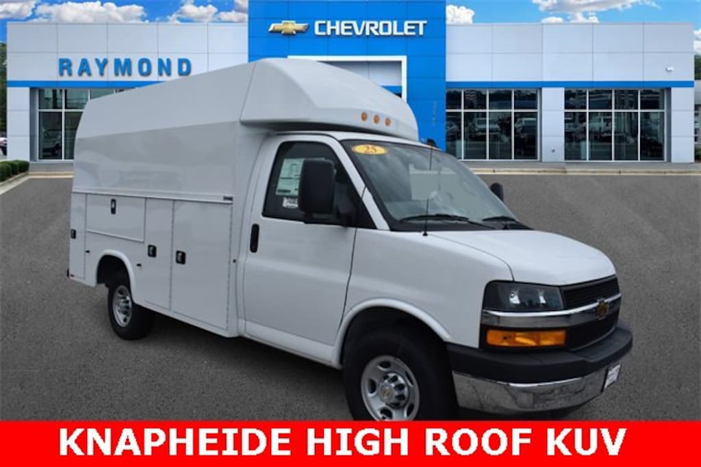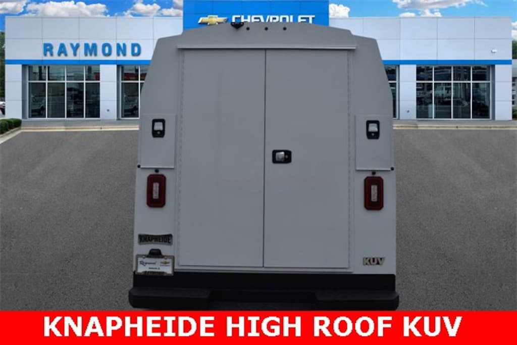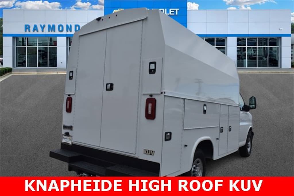 **COMMERCIAL VEHICLE** **KNAPHEIDE HIGH ROOF KUV** **80 CAB TO AXLE 129 BODY LENGTH 75.8 INTERIOR BODY HEIGHT** **KNAPLOCK KEYLESS ENTRY SYSTEM** **BACKUP ALARM** **RECEIVER HITCH-CLASS V** **ELECTRIC BRAKE CONTROL** **REDUCER SLEEVE- CLASS V** 2025 Chevrolet Express 3500 Work Van Cutaway RWD