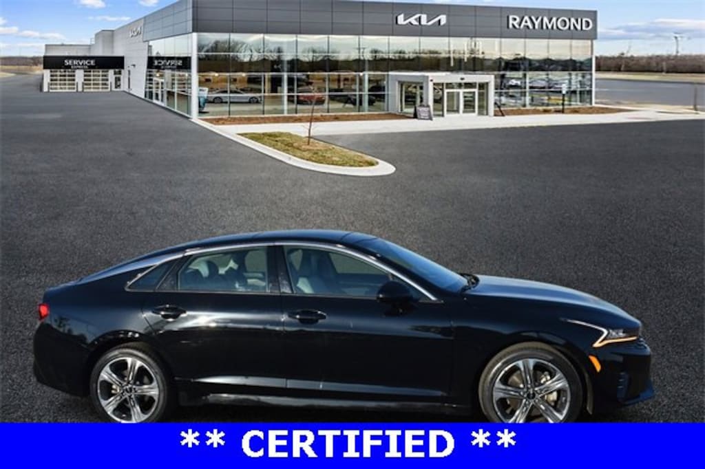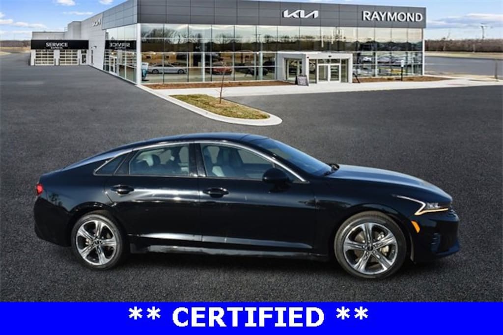 CARFAX One-Owner. Certified. Ebony Black 2023 Kia K5 EX FWD 8-Speed Automatic 1.6L I4 DGI Turbocharged DOHC 16V LEV3-ULEV70 180hp EX Ash Blue Color Package, Navigation System, Power moonroof, Radio: AM/FM/MP3 Audio System, Smart Key w/ Push Button and Remote Start, Steering wheel mounted audio controls.